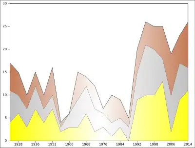 En hiver, c'est aux Jeux de 2018 à PyeongChang, que la moisson fut la meilleure avec 39 médailles (14 en or, 14 en argent et 11 en bronze).