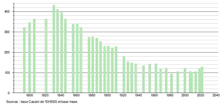 L'évolution du nombre d'habitants est connue à travers les recensements de la population effectués dans la commune depuis 1793. Pour les communes de moins de 10 000 habitants, une enquête de recensement portant sur toute la population est réalisée tous les cinq ans, les populations légales des années intermédiaires étant quant à elles estimées par interpolation ou extrapolation[30]. Pour la commune, le premier recensement exhaustif entrant dans le cadre du nouveau dispositif a été réalisé en 2008[31].