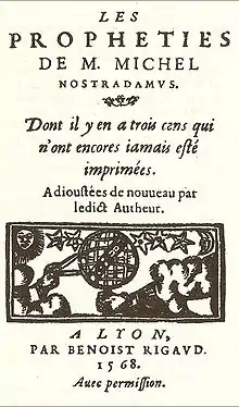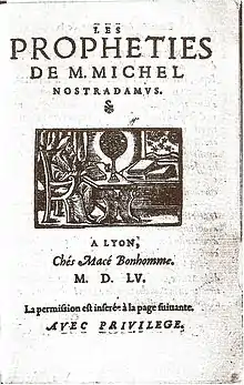 Comme dit précédemment, la première édition des Prophéties est publiée le 4 mai 1555 par l’imprimeur lyonnais Macé (Matthieu) Bonhomme[50]. Plusieurs éditions sont considérées comme piratées ou antidatées, mais on admet en général que l'édition (augmentée) qui porte la date de septembre 1557 fut réellement publiée du vivant de Nostradamus. L'existence d'une édition de 1558 est moins sûre, aucun exemplaire n'ayant survécu. Le livre est partagé en Centuries, une centurie étant, théoriquement, un ensemble de cent quatrains. La septième centurie resta toujours incomplète. La première édition, pleine de références savantes, contient 353 quatrains prophétiques, la dernière, publiée deux ans après la mort de Nostradamus, 942 – soit 58 quatrains de moins que les 1 000 qu'il avait annoncés (« parachevant la milliade »). Les Prophéties ont donné lieu à la publication de près de dix mille ouvrages. Parmi les exégètes les plus célèbres, on peut mentionner Anatole Le Pelletier, Vlaicu Ionescu, Jean-Charles de Fontbrune et son père, Serge Hutin et Erika Cheetham, qui croient à la prescience de Nostradamus, et Eugene F. Parker, Edgar Leoni, Louis Schlosser et surtout Pierre Brind'Amour, qui n'y croient pas. D'autres comme Robert Benazra, Michel Chomarat et Daniel Ruzo, se sont appliqués à recenser les éditions de ses œuvres et les ouvrages qui le concernent.