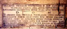 Certains y ont vu la preuve qu'il connaissait les circonstances de sa mort. On dit qu'on le retrouva mort, près de son lit et d'un banc de bois, le 2 juillet 1566, au retour d'un voyage où il avait représenté sa ville auprès du roi (donc une ambassade) et y avait reçu le titre de médecin ordinaire du roi. Ce qui est attesté, c'est qu'il représenta Salon-de-Crau en ambassade[réf. souhaitée] à Arles auprès du roi en 1564, qu'il fut par la suite richement doté par le roi. Il fut retrouvé mort le 2 juillet 1566 au matin, et non en novembre, ce qui laisse cependant entier le doute quant à la prophétie, puisque celle-ci ne sera publiée que deux ans après sa mort, et en forme apparemment rétro-éditée. Il mourut à Salon-de-Provence d'un œdème dit cardio-pulmonaire. On connaît son testament et le devenir exact de sa dépouille : son tombeau fut édifié dans l’église des Cordeliers puis profané en 1793 par des sans-culottes, ses ossements étant pillés et dispersés. Un Marseillais, d’après la tradition locale, se serait emparé du crâne et aurait bu dedans[48]. Finalement le maire David fit transférer les reliques qu'il avait pu sauver dans la collégiale Saint-Laurent[49], à Salon-de-Provence.