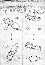 Mais c'est en 1700 que paraît un ouvrage que l'on peut considérer comme le premier grand manuel de notation de la danse : Chorégraphie, ou l'art de décrire la dance, publié à Paris par le maître de danse Raoul Feuillet, qui reprend les travaux préalables d'un autre maître de danse, Pierre Beauchamp, propose dans sa Chorégraphie de décrire les danses de la façon suivante : la feuille de papier représente la salle où l'on danse vue d'en haut (le côté haut, où se trouve la portée musicale, désigne l'emplacement du public dans le cas d'une danse de théâtre) ; un « chemin » représente le trajet parcouru par chacun des danseurs ; ce chemin est ponctué de petites barres correspondant aux barres de mesure de la musique. De part et d'autre du chemin, des « figures » de pas et de position désignent les actions du danseur ; sur ces figures sont greffés de petits « signes » représentant des actions de base, telles que plier, glisser, tomber, élever, sauter, cabrioler, tourner, pied en l'air, pied pointé.
