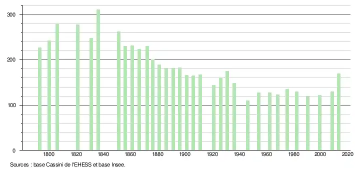 - Dans le tableau des recensements et le graphique, par convention dans Wikipédia, le principe a été retenu, pour les populations légales postérieures à 1999 de n’afficher dans le tableau des recensements et le graphique que les populations correspondant à l'année 2006, première population légale publiée calculée conformément aux concepts définis dans le décret no 2003-485 du 5 juin 2003, et les années correspondant à une enquête exhaustive de recensement pour les communes de moins de 10 000 habitants, ainsi que la dernière population légale publiée par l’Insee.