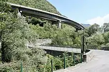 Notre-Dame-de-Briançon depuis le château de Briançon. En arrière-plan, le viaduc du Champ-du-Comte | |