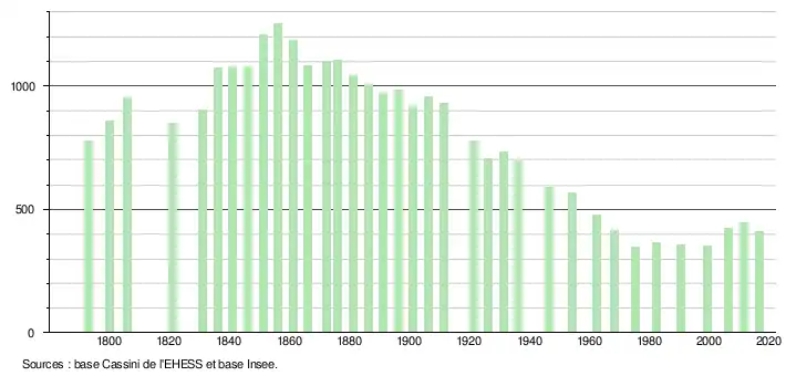 L'évolution du nombre d'habitants est connue à travers les recensements de la population effectués dans la commune depuis 1793. Pour les communes de moins de 10 000 habitants, une enquête de recensement portant sur toute la population est réalisée tous les cinq ans, les populations légales des années intermédiaires étant quant à elles estimées par interpolation ou extrapolation[3]. Pour la commune, le premier recensement exhaustif entrant dans le cadre du nouveau dispositif a été réalisé en 2006[4].