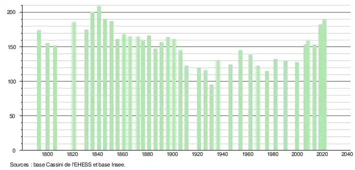L'évolution du nombre d'habitants est connue à travers les recensements de la population effectués dans la commune depuis 1793. Pour les communes de moins de 10 000 habitants, une enquête de recensement portant sur toute la population est réalisée tous les cinq ans, les populations légales des années intermédiaires étant quant à elles estimées par interpolation ou extrapolation[22]. Pour la commune, le premier recensement exhaustif entrant dans le cadre du nouveau dispositif a été réalisé en 2008[23].