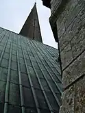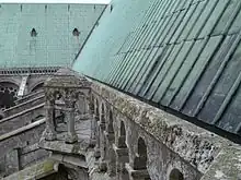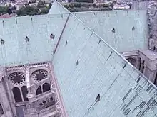 Grâce à la révolution industrielle et sa foi dans les possibilités architecturales de nouveaux matériaux incombustibles, l'architecte départemental Édouard Baron propose son remplacement par une charpente métallique de 600 tonnes de fonte et de fer laminé, et une toiture constituée de 11 000 plaques de cuivre. La charpente est réalisée de 1836 à 1841 par l'ingénieur Émile Martin et l'entrepreneur parisien de serrurerie Sylvain Mignon, tandis que Quenehen réalise la couverture en cuivre[38]. L'effort est soutenu par des dons et plusieurs lois de financement que fait voter le ministre des Cultes Sauzet, l'État propriétaire des cathédrales depuis le Concordat de 1801 prenant à sa charge une grande partie de la reconstruction[39].