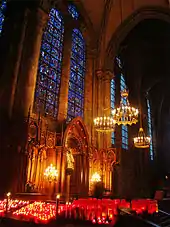 L'orfèvrerie et l'argenterie du trésor sont également fondus. La statue de Notre-Dame-de-Sous-Terre est livrée aux flammes. Le député de la Convention Sergent-Marceau, originaire de Chartres, est nommé en , adjoint à la commission conservatrice des monuments des arts. C'est à ce titre qu'il prend des mesures pour que soit évitée la destruction de toutes les sculptures et même de tout l'édifice[35]. Les chapelles absidiales reçoivent même des embellissements grâce à l'entrepreneur-architecte Laurent Morin[34].