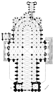 Les deux bas-côtés deviennent doubles à l'entrée du chevet. Les bras du transept se composent de trois travées voûtées d'ogives quadripartites sur plan barlong et sont percés en leurs extrémités de trois portails précédés de porches flanqués de tourelles qu'une flèche devait dominer[Note 9]. Le projet primitif envisageait peut-être une tour couronnant le carré oblong du transept comme le suggèrent les quatre piles massives composées de colonnes engagées qui cantonnent ce carré[62].