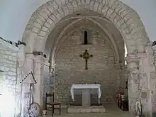 Dans ce sanctuaire à chevet plat, reconstruit en 1665, avec un ermitage qui s'appuie sur son chevet, puis au début du XIXe siècle[3], il ne subsiste de la chapelle romane primitive que les sculptures du chœur, quatre consoles en forme de têtes d’atlante que les archéologues ont daté du XIIIe siècle[2]. « Ces quatre têtes sont d'une diversité technique et d'une richesse symbolique tout à fait remarquables[3], » d'autant qu'il est à souligner que leurs thèmes se rattachent à la mythologie scandinave, « cas unique et inexplicable en pays méditerranéen[1]. ».