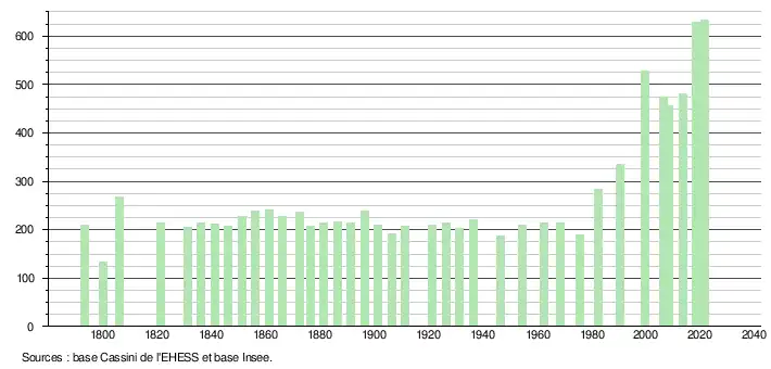 L'évolution du nombre d'habitants est connue à travers les recensements de la population effectués dans la commune depuis 1793. Pour les communes de moins de 10 000 habitants, une enquête de recensement portant sur toute la population est réalisée tous les cinq ans, les populations légales des années intermédiaires étant quant à elles estimées par interpolation ou extrapolation[17]. Pour la commune, le premier recensement exhaustif entrant dans le cadre du nouveau dispositif a été réalisé en 2008[18].