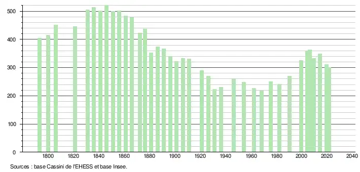 L'évolution du nombre d'habitants est connue à travers les recensements de la population effectués dans la commune depuis 1793. Pour les communes de moins de 10 000 habitants, une enquête de recensement portant sur toute la population est réalisée tous les cinq ans, les populations légales des années intermédiaires étant quant à elles estimées par interpolation ou extrapolation[34]. Pour la commune, le premier recensement exhaustif entrant dans le cadre du nouveau dispositif a été réalisé en 2004[35].