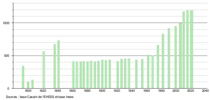 L'évolution du nombre d'habitants est connue à travers les recensements de la population effectués dans la commune depuis 1793. Pour les communes de moins de 10 000 habitants, une enquête de recensement portant sur toute la population est réalisée tous les cinq ans, les populations légales des années intermédiaires étant quant à elles estimées par interpolation ou extrapolation[19]. Pour la commune, le premier recensement exhaustif entrant dans le cadre du nouveau dispositif a été réalisé en 2005[20].