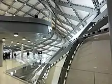 - La partie souterraine, qui comprend les salles de l'auditorium/polyvalentes, les salles de réunion, le concorse (l'espace qui relie les deux entrées), des services annexes et un parking;