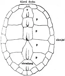 Il faut d'abord souligner les différences majeures entre le plan corporel de la tortue et celui des autres vertébrés, qui est le résultat d'un changement dans le patron du développement du squelette des tortues[13]. Alors que les omoplates des vertébrés se retrouvent à l'extérieur de la cage thoracique, celles de la tortue sont plutôt à l'intérieur[14]. Ce phénomène a également un impact sur le point d'attachement de deux muscles : le muscle dentelé antérieur et le muscle élévateur de la scapula. Les muscles chez la tortue s'attachent dorsalement et ventralement à l'intérieur de la cage thoracique, alors qu'ils sont externes chez les autres vertébrés. Le changement dans la position de l'omoplate et dans l'attachement des muscles est causé par la croissance particulière des côtes.