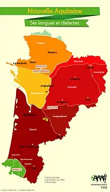 occitan : gascon-béarnais, languedocien, limousin, auvergnat, marchois ; basque : souletin, navarro-labourdin ; langues d'oïl : poitevin, saintongeais |