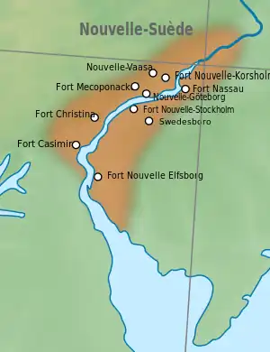 Elle était centrée sur Fort Christina, maintenant dans Wilmington, au Delaware et comprenait des territoires aujourd'hui dans les États du Delaware, du New Jersey et de la Pennsylvanie. À côté des Suédois, on trouvait de nombreux colons finnois ou néerlandais.