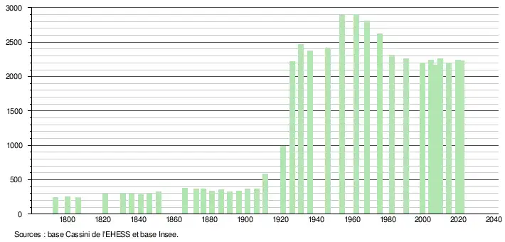 L'évolution du nombre d'habitants est connue à travers les recensements de la population effectués dans la commune depuis 1793. Pour les communes de moins de 10 000 habitants, une enquête de recensement portant sur toute la population est réalisée tous les cinq ans, les populations légales des années intermédiaires étant quant à elles estimées par interpolation ou extrapolation[25]. Pour la commune, le premier recensement exhaustif entrant dans le cadre du nouveau dispositif a été réalisé en 2004[26].