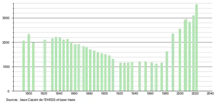 L'évolution du nombre d'habitants est connue à travers les recensements de la population effectués dans la commune depuis 1793. Pour les communes de moins de 10 000 habitants, une enquête de recensement portant sur toute la population est réalisée tous les cinq ans, les populations légales des années intermédiaires étant quant à elles estimées par interpolation ou extrapolation[28]. Pour la commune, le premier recensement exhaustif entrant dans le cadre du nouveau dispositif a été réalisé en 2007[29].