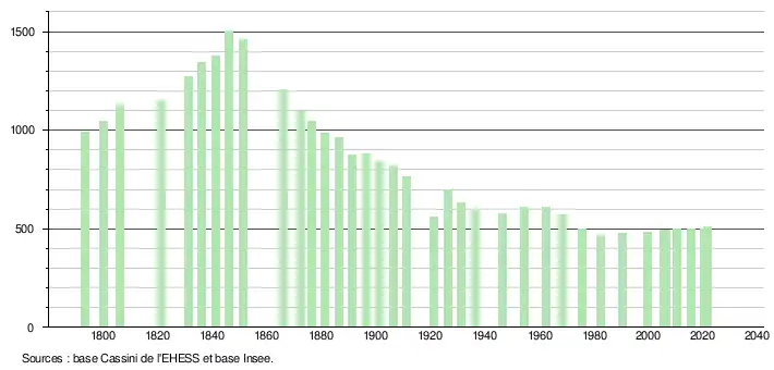 L'évolution du nombre d'habitants est connue à travers les recensements de la population effectués dans la commune depuis 1793. Pour les communes de moins de 10 000 habitants, une enquête de recensement portant sur toute la population est réalisée tous les cinq ans, les populations légales des années intermédiaires étant quant à elles estimées par interpolation ou extrapolation[19]. Pour la commune, le premier recensement exhaustif entrant dans le cadre du nouveau dispositif a été réalisé en 2005[20].