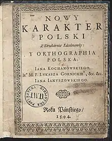 Nowy karakter polski est livre édité par Jan Januszowski (pl) et publié par la Drukarnia Łazarzowa (pl) en 1594, contenant trois traités sur l’orthographe polonaise de Łukasz Górnicki, Jan Kochanowski et Januszowski lui-même. Plusieurs nouvelles lettres et ligatures sont proposées pour l’écriture du polonais. Des polices de caractères créées avec ces caractères y sont utilisées.