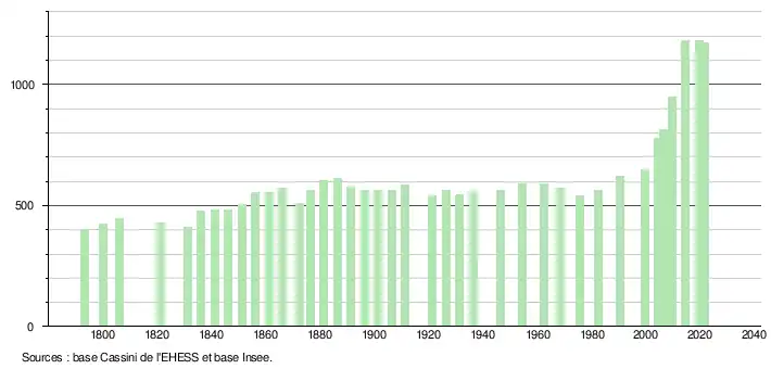 L'évolution du nombre d'habitants est connue à travers les recensements de la population effectués dans la commune depuis 1793. Pour les communes de moins de 10 000 habitants, une enquête de recensement portant sur toute la population est réalisée tous les cinq ans, les populations légales des années intermédiaires étant quant à elles estimées par interpolation ou extrapolation[21]. Pour la commune, le premier recensement exhaustif entrant dans le cadre du nouveau dispositif a été réalisé en 2004[22].