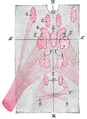 9. Nerf trochléaire, avec 9’, son noyau d'origine et 9", sa décussation.