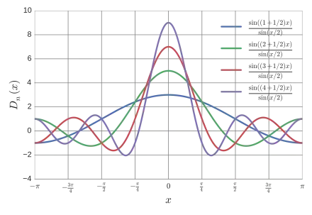 Lorsque , c'est-à-dire lorsque x appartient à 2πℤ, le noyau de Dirichlet est la somme de 2n + 1 termes chacun égaux à 1, et vaut donc 2n + 1.