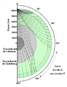 Les études des ondes sismiques qui se propagent à l'intérieur du globe terrestre ont permis à Richard Oldham [1] de proposer l'existence d'un noyau central, plus dense, à l'intérieur de la Terre. En effet, les ondes sismiques P, ou ondes primaires ou de compression, se réfractent vers le bas à l'interface Noyau Manteau, située à 2 900 km de profondeur, laissant une "zone d'ombre" à la surface de la Terre, c'est-à dire une zone où les ondes P n'apparaissent plus sur les sismogrammes enregistrés. Cette zone d'ombre est située à une distance de 103 à 142° de l'épicentre du séisme (cf figure). Cette discontinuité sismique est connue sous le nom de discontinuité de Gutenberg, selon le nom du sismologue allemand Beno Gutenberg qui caractérisa cette interface en 1914[2].