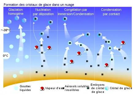 La pression partielle est difficile à vaincre pour créer des cristaux de glace à partir d'eau surfondue dans de l'air sans impuretés, celle-ci peut rester liquide jusque vers −40 °C (congélation homogène). De même, les molécules de vapeur d'eau doivent avoir un support sur lequel se déposer (condensation par contact)[3]. Les noyaux glacigènes ont une structure cristalline similaire à celle de la glace qui favorise le changement à l'état solide dans les deux cas à partir de −10 °C (congélation par immersion et déposition)[1].