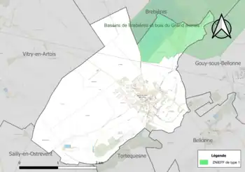 Le territoire communal comprend une ZNIEFF de type 1[Note 1] : les bassins de Brebières et bois du grand marais. Cette ZNIEFF associe de vastes zones en eau (bassins de décantation) avec vasières et roselières et des végétations forestières dégradées par la plantation massive de peupliers[8].