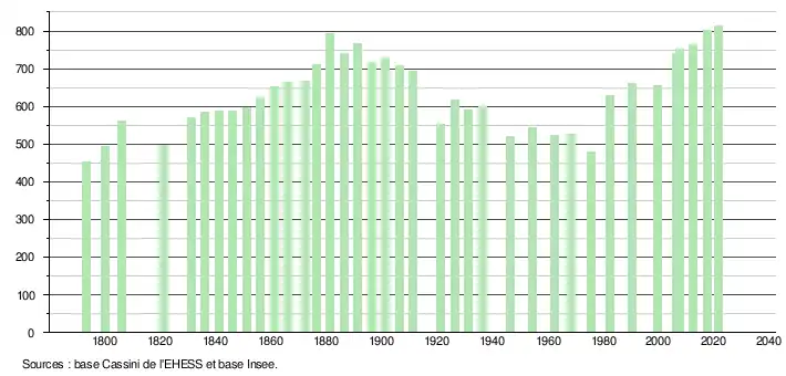 L'évolution du nombre d'habitants est connue à travers les recensements de la population effectués dans la commune depuis 1793. Pour les communes de moins de 10 000 habitants, une enquête de recensement portant sur toute la population est réalisée tous les cinq ans, les populations légales des années intermédiaires étant quant à elles estimées par interpolation ou extrapolation[37]. Pour la commune, le premier recensement exhaustif entrant dans le cadre du nouveau dispositif a été réalisé en 2007[38].