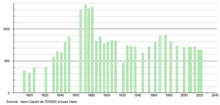 L'évolution du nombre d'habitants est connue à travers les recensements de la population effectués dans la commune depuis 1793. Pour les communes de moins de 10 000 habitants, une enquête de recensement portant sur toute la population est réalisée tous les cinq ans, les populations légales des années intermédiaires étant quant à elles estimées par interpolation ou extrapolation[35]. Pour la commune, le premier recensement exhaustif entrant dans le cadre du nouveau dispositif a été réalisé en 2008[36].