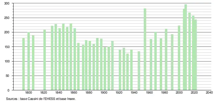 L'évolution du nombre d'habitants est connue à travers les recensements de la population effectués dans la commune depuis 1793. Pour les communes de moins de 10 000 habitants, une enquête de recensement portant sur toute la population est réalisée tous les cinq ans, les populations légales des années intermédiaires étant quant à elles estimées par interpolation ou extrapolation[19]. Pour la commune, le premier recensement exhaustif entrant dans le cadre du nouveau dispositif a été réalisé en 2008[20].