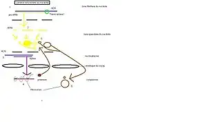 - la zone fibrillaire, centrale, où on retrouve l'ADN possédant les gènes codant l'ARN précurseur 45S ;