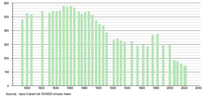 L'évolution du nombre d'habitants est connue à travers les recensements de la population effectués dans la commune depuis 1793. Pour les communes de moins de 10 000 habitants, une enquête de recensement portant sur toute la population est réalisée tous les cinq ans, les populations légales des années intermédiaires étant quant à elles estimées par interpolation ou extrapolation[14]. Pour la commune, le premier recensement exhaustif entrant dans le cadre du nouveau dispositif a été réalisé en 2005[15].