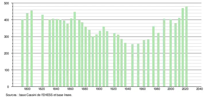 L'évolution du nombre d'habitants est connue à travers les recensements de la population effectués dans la commune depuis 1793. Pour les communes de moins de 10 000 habitants, une enquête de recensement portant sur toute la population est réalisée tous les cinq ans, les populations légales des années intermédiaires étant quant à elles estimées par interpolation ou extrapolation[34]. Pour la commune, le premier recensement exhaustif entrant dans le cadre du nouveau dispositif a été réalisé en 2006[35].