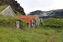 Autour de l'habitation principale (un bâtiment de pierre, construit sur deux niveaux), une chapelle et dix-huit dépendances plus ou moins délabrées confèrent au lieu un charme magique : toutes sont en bois et à toiture de gazon, témoignage de l'habitat des siècles passés. Cette technique de construction est connue en Europe du Nord dès l'âge de fer : elle consiste à couvrir l'édifice d'une épaisse couche de tourbe ou de terre enherbée, très efficace contre les rigueurs du climat. Vers la fin du XVIIIe siècle, une variante s'est développée en Islande avec façades et charpente en bois, tandis que toiture et côtés latéraux sont recouverts de terre[1].