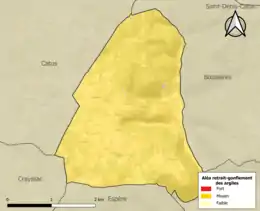 Le retrait-gonflement des sols argileux est susceptible d'engendrer des dommages importants aux bâtiments en cas d’alternance de périodes de sécheresse et de pluie. 99,9 % de la superficie communale est en aléa moyen ou fort (67,7 % au niveau départemental et 48,5 % au niveau national). Sur les 187 bâtiments dénombrés sur la commune en 2019, 186 sont en aléa moyen ou fort, soit 99 %, à comparer aux 72 % au niveau départemental et 54 % au niveau national. Une cartographie de l'exposition du territoire national au retrait gonflement des sols argileux est disponible sur le site du BRGM[21],[Carte 2].