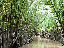 Le palmier Nypa fruticans pousse dans la vase ou la boue, où le courant de la marée lui apporte les nutriments nécessaires à sa croissance. Le palmier peut se disséminer aussi loin que le courant parvient à déposer les graines. Il est courant sur les côtes et les rivières de l'océan Indien et de l'océan Pacifique du Bangladesh aux îles du Pacifique.