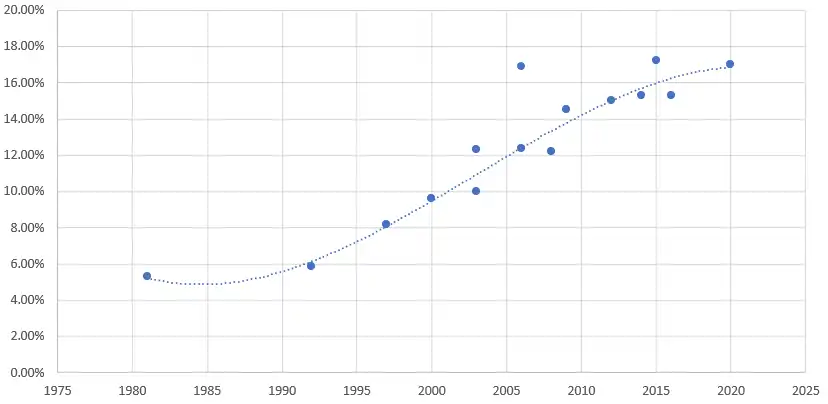 | Sexe | 1981 | 1992 | 1997 | 2000 | 2003 | 2003 | 2006 | 2009 | 2012 | 2015 | 2016 | 2020 | Augmentation annuelle |