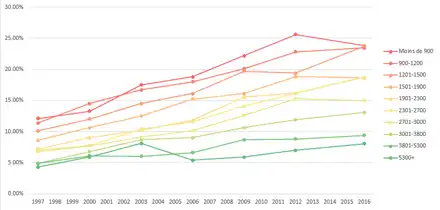 | Moins de 900 € | 12,1 % | 13,3 % | 17,5 % | 18,8 % | 22,2 % | 25,6 % | 5,12 % |