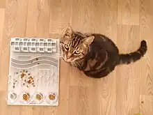 Plusieurs stratégies de distribution sont possibles. L'alimentation peut être distribuée de manière fractionnée tout au long de la journée, ce qui présente l'avantage d'être en accord avec le comportement naturel du chat[20],[7], qui fait entre une dizaine et une vingtaine de repas par jour. Il est possible de proposer un aliment peu appétant mais laissé à volonté à différents endroits de l'habitat de l'animal, ce qui l'amène à rechercher sa nourriture[7].