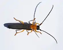 La tête et les antennes sont noires, les antennes plus courtes que le corps. Le pronotum est orange, avec deux taches noires allongées sur les côtés. Les élytres sont principalement noirâtres, jaunâtres à la base et plutôt poilus. Le corps est orange, avec des marques noires sur les côtés et sous l'abdomen. Le dernier segment abdominal présente une marque noire. Les pattes sont orange.