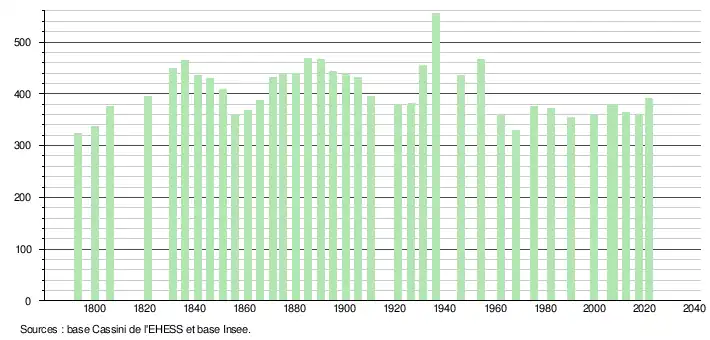 L'évolution du nombre d'habitants est connue à travers les recensements de la population effectués dans la commune depuis 1793. Pour les communes de moins de 10 000 habitants, une enquête de recensement portant sur toute la population est réalisée tous les cinq ans, les populations légales des années intermédiaires étant quant à elles estimées par interpolation ou extrapolation[20]. Pour la commune, le premier recensement exhaustif entrant dans le cadre du nouveau dispositif a été réalisé en 2007[21].