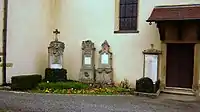 Sur le côté gauche de l'église on trouve quatre anciennes tombes de curés qui ont officié à Obermorschwihr. Cette pratique d'enterrer les curés à côté ou à l'intérieur de l'église était courante en Alsace entre le XVIIIe et XIXe siècle.