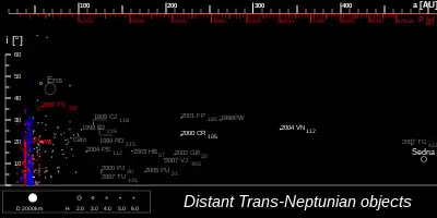 | 148209 | 2000 CR105 | ≈ 250 | 6.1 | 44.0 | 224 | 403 | 316.5 | 2000 | Lowell Observatory | estimé | [3] |