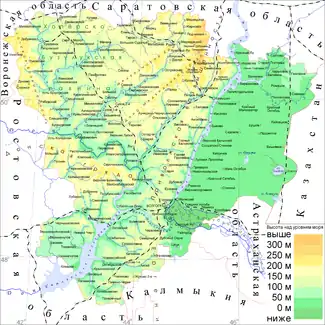 L'oblast s'étend sur 112 877 km2 et est limitrophe des oblasts de Saratov, Rostov, Astrakhan et Voronej, de la république de Kalmoukie et du Kazakhstan.