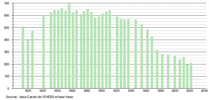 L'évolution du nombre d'habitants est connue à travers les recensements de la population effectués dans la commune depuis 1793. Pour les communes de moins de 10 000 habitants, une enquête de recensement portant sur toute la population est réalisée tous les cinq ans, les populations légales des années intermédiaires étant quant à elles estimées par interpolation ou extrapolation[31]. Pour la commune, le premier recensement exhaustif entrant dans le cadre du nouveau dispositif a été réalisé en 2006[32].