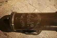 Celui-ci est très court (85 cm), en bronze, de calibre 36 livres, nécessitant cinq hommes pour le servir.