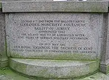 - Texte de la plaque en anglais : « On 8 May 1945 from the balcony above Alexander Moncrieff Coutanche, Bailiff of Jersey, announced that the island was to be liberated after five years of German military occupation. On 10 May 1985 Her Royal Highness the Duchess of Kent unveiled this plaque to commemorate the Liberation. »